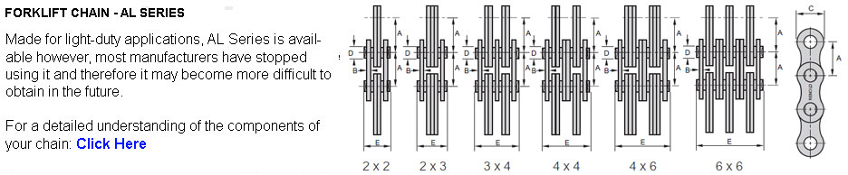 | Availability | Chain No. | Pitch | Lacing | Plate Thickness | Plate Height | Pin Diameter | Pin Length | Average Chain Weight |
